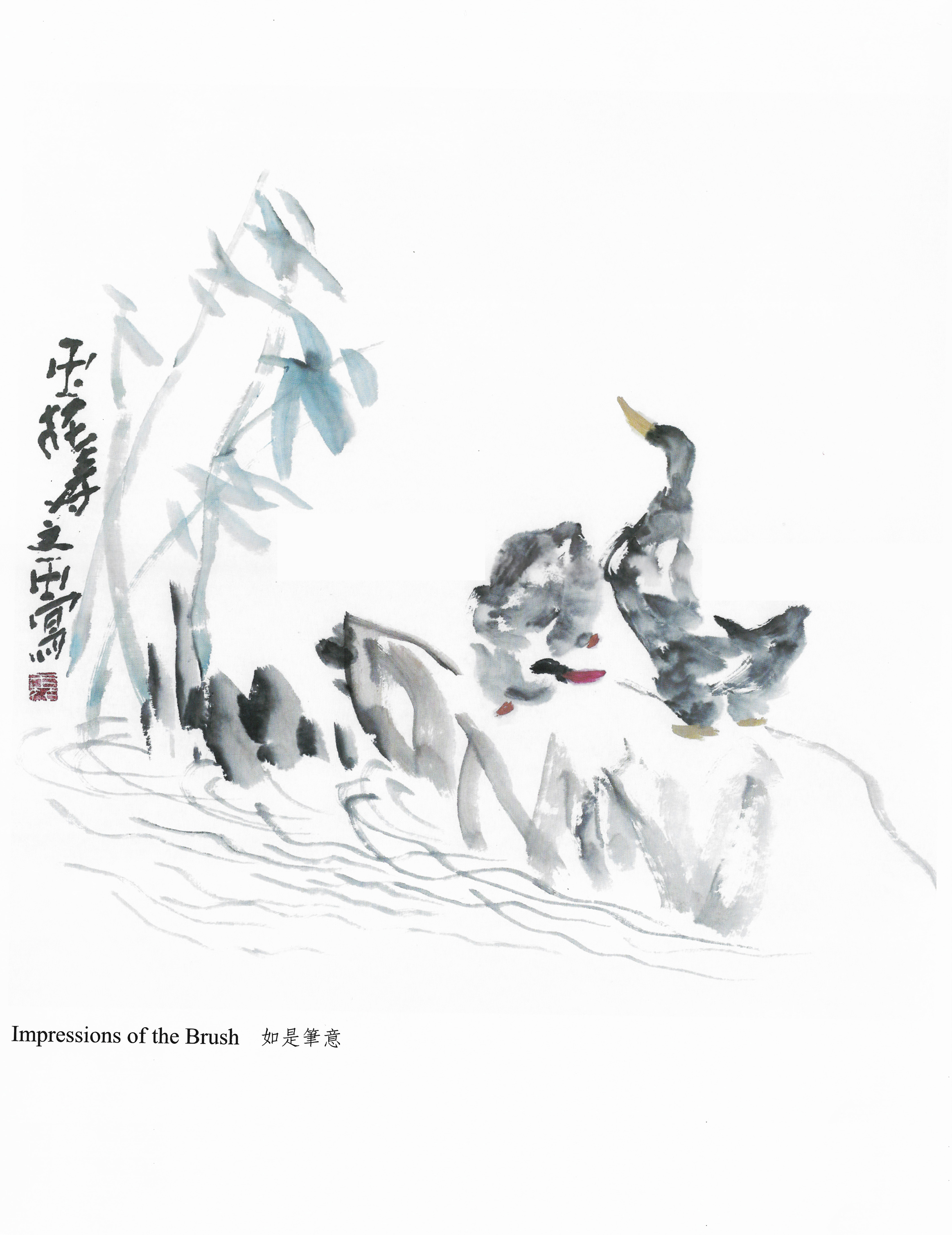 这幅作品的设色也极为简单巧妙,以花青写出竹叶,确定了画面中乍暖还冷的初春基调,两只老鸭的嘴巴脚蹼的敷色,一只是红色的,浓郁的丹红色出现在这特定的画面,一下子就联想到“竹外桃花三两枝,春江水暖鸭先知”的诗句,作品的底蕴顿然浑厚起来,同时也与朱红色的图章构成呼应;另一只翘首老鸭的嘴巴脚蹼却是黄赭色,这种颜色,恰好给画面当中的丹红色降了一个色阶,同时与花青色的竹叶又构成对比和统一。