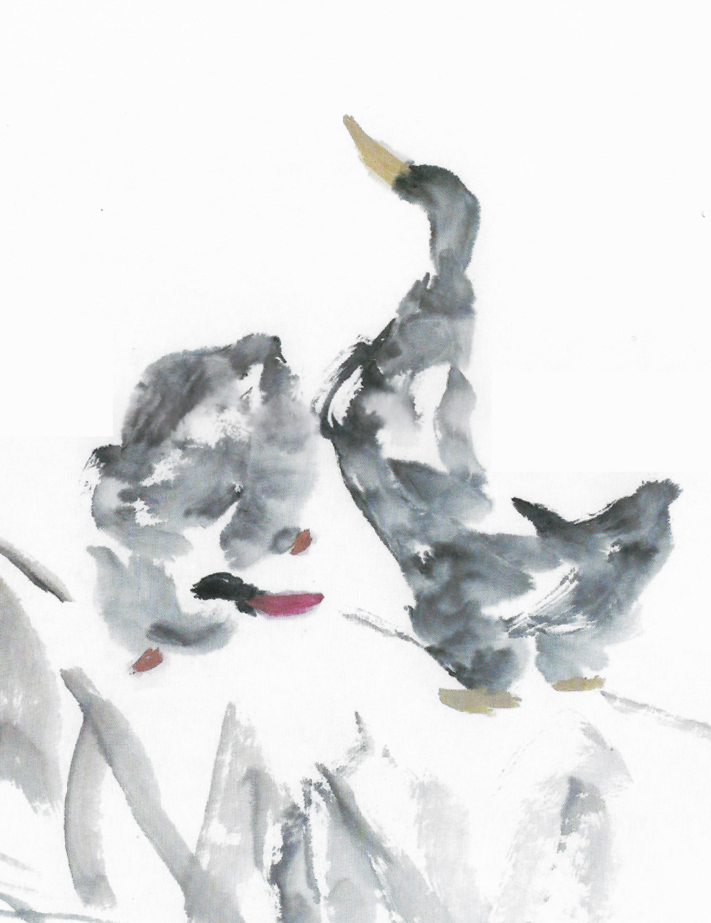 翘首老鸭茫然若失的情态,引导着观赏者的眼光,激活了画面的空白,也引发了人们的联想,沿着老鸭仰望的方向观看,仿佛有青山矗立,绿树掩映,茅屋村舍依稀可见。令人不禁想起上世纪八十年代程琳演唱的歌曲,在那遥远的小山村,小呀小山村……