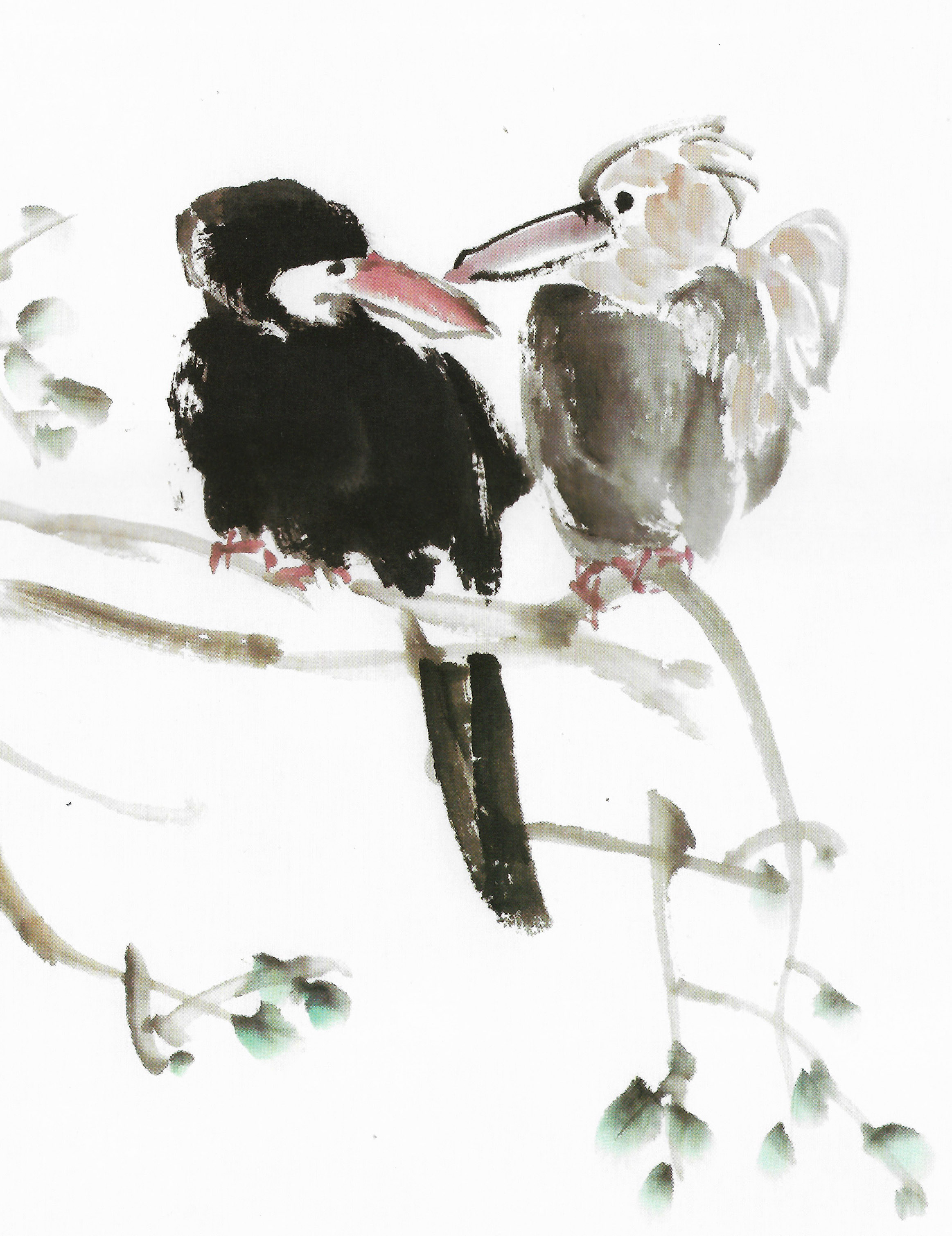 细看,落墨似不经意,逸笔草草之间,一双鸟儿便落枝头,左边黑色鸭鸟匍匐在枝干,右边淡色的另一只,双爪谨慎地紧紧把定在枝头,此刻仿佛正在窃窃私语,一对芝麻粒大的眼睛正在相对而视,似乎在传达交流着对这个世界的看法以及彼此的情感,稚气笨拙的憨态令人忍俊不禁。