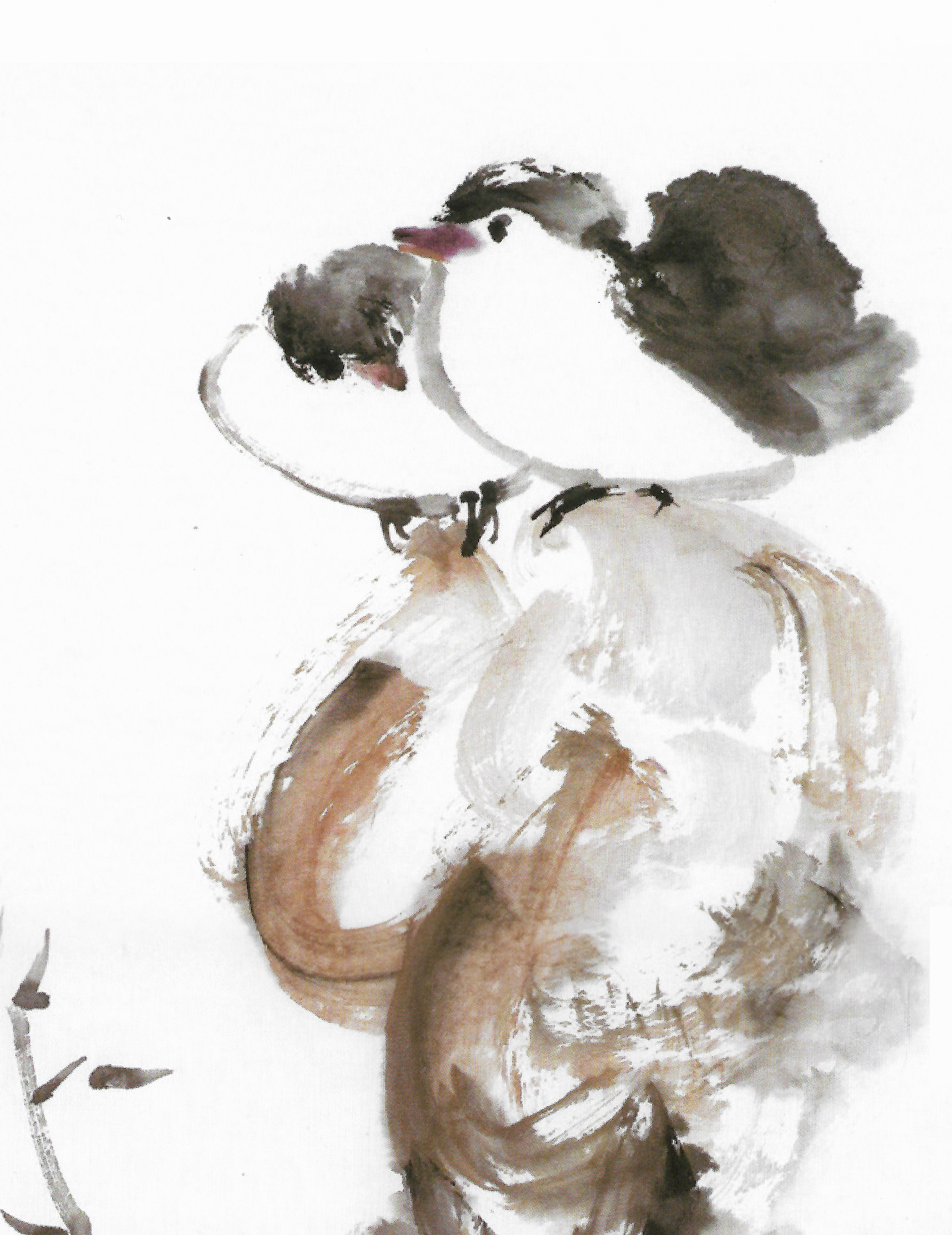 见到这幅作品,我的心就被这清新明澈的画境融化了。美妙的鸟语,似乎在耳边约隐约显,一双憨态可掬的小鸟,仿佛从天外刚刚来到人间,其中一只俯视着脚下的土地,另一只正好奇地端详着远方。